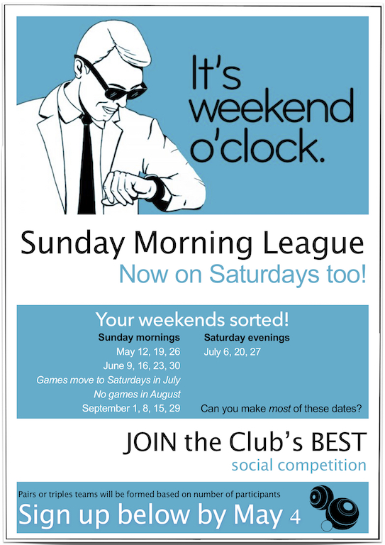 Registration is now open for the Sunday Morning League. Please sign up soon either by email to the Captain or by hand on the Lawn Bowls Noticeboard.