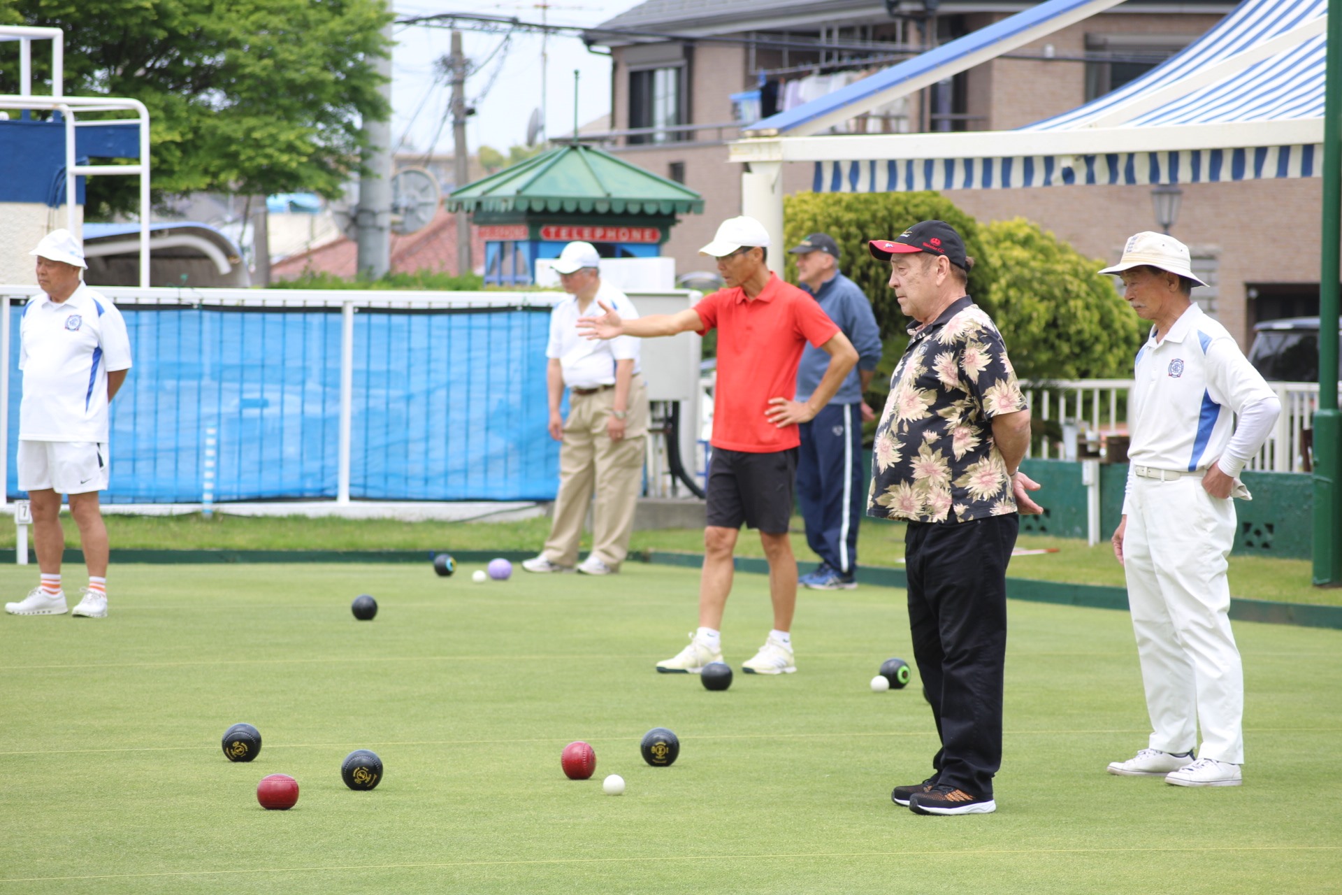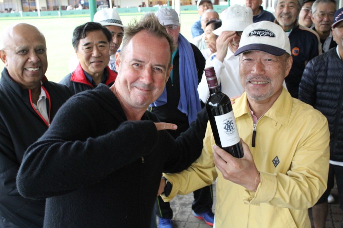 George Ishiguro won the inaugural Spider with some help from a late arriving wood from his wife, Yoko, who finished second. Somewhat eerily the centrally placed wood of the late Don Helm, after whom the Opening Day Tournament is named, received not so much as a nick in the woody deluge. George’s winning bowl is the minty green wood entering stage left in the video below. (Watch on youtube for a sharper picture.)