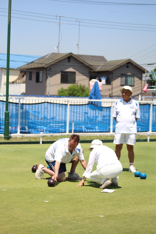 Saito had played brilliantly and was 6-2 up going into the final end. However, my opponent chose this end to play his loosest bowls, and I rolled in four to force an unlikely comeback draw. The all-important fourth wood in the count was only called after multiple attempts with the measure including two by the tournament umpire.