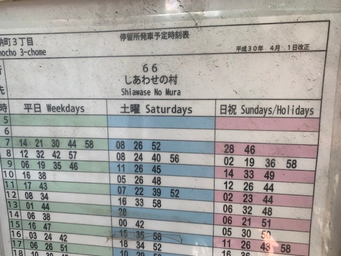 Onwards, and here was another auspicious number. From Sannomiya it’s a no. 66 bus to Shiawase no Mura. 66 is the year I was born. The other big event of that year was England winning the World Cup.