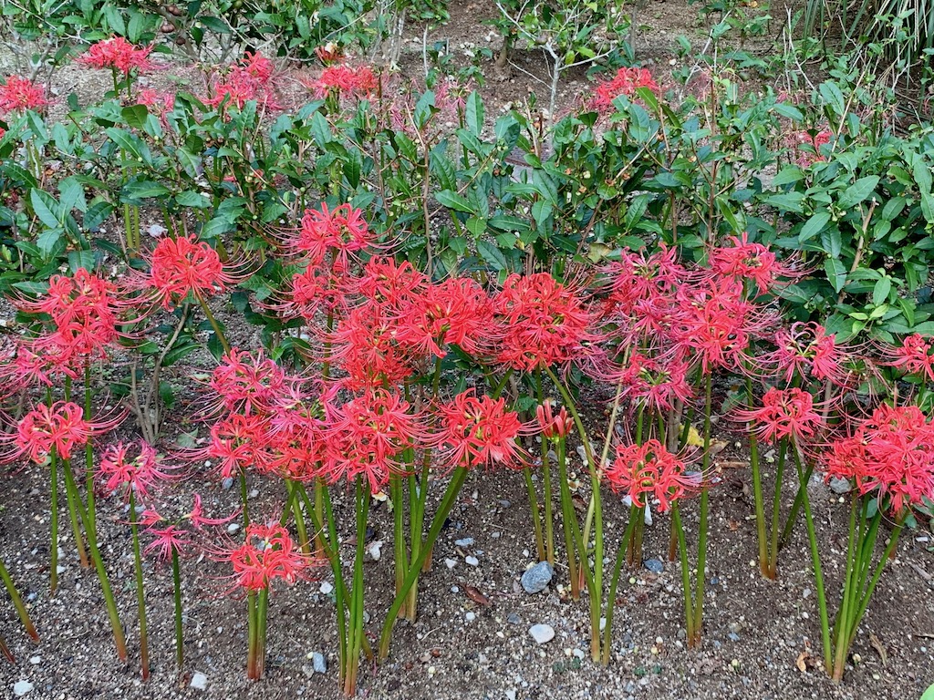 Likewise, though less common, the red spider lily, planted here among tea shrubs.