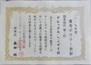 Alex Hendy and Kazuko Yasuda today “received” certificates of excellence from Bowls Japan. In 2019, the two bowlers finished equal second on merit points in the Kanto region, according to the Bowls Japan system of accreditation.