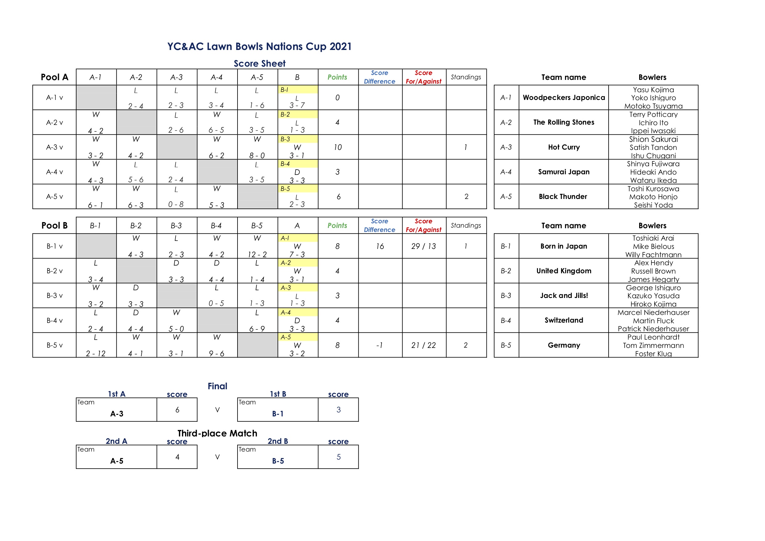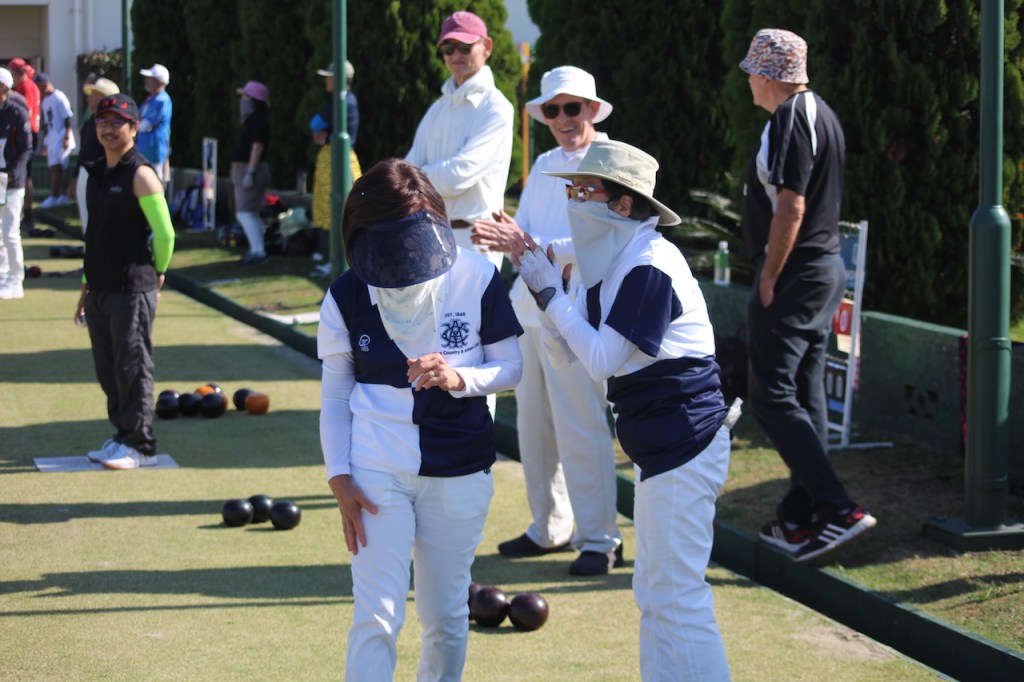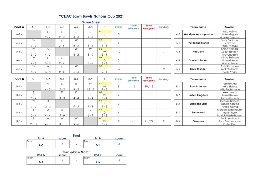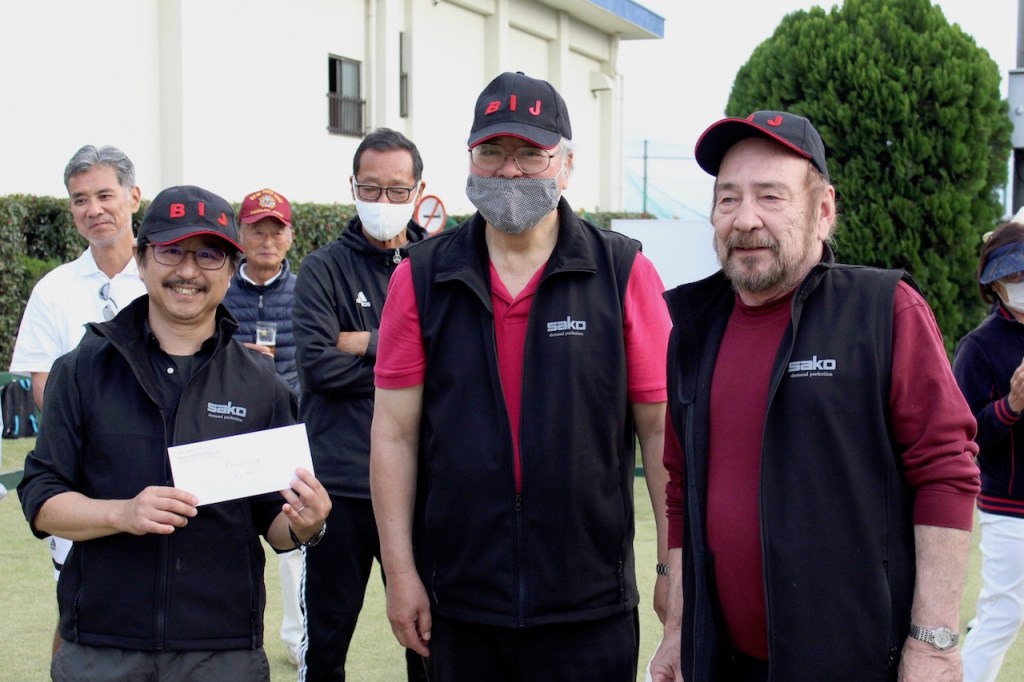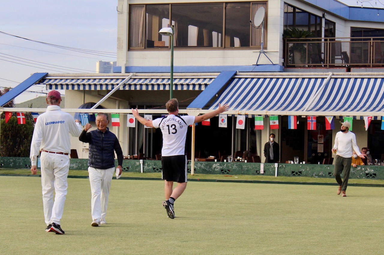 The YC&AC Lawn Bowls Nations Cup and (latest) shield. The tournament was first played (on a non-standard green) in 1920.Black Thunder’s Honjo sends one downShion in action for Hot CurryGeorge-copterThe Swiss do battle with the BritsGreat shot, Hiroko!Wataru measures a close callHide leaves others to do the mathsIn the third-place match, Germany beat Black Thunder with another last-wood winner from skip FosterBlack Thunder’s Honjo, Toshi and Yoda with Germany’s Tom, Paul and FosterTomo and Rich joined the bowlers on the wall to watch the climax of the finalBorn in Japan skip Mike inspects the head before sending down his last wood in the final against Hot CurryRunners-up Born in Japan: Arai, Willy and MikeWinners Hot Curry: Satish, Shion and IshuChampions of the world