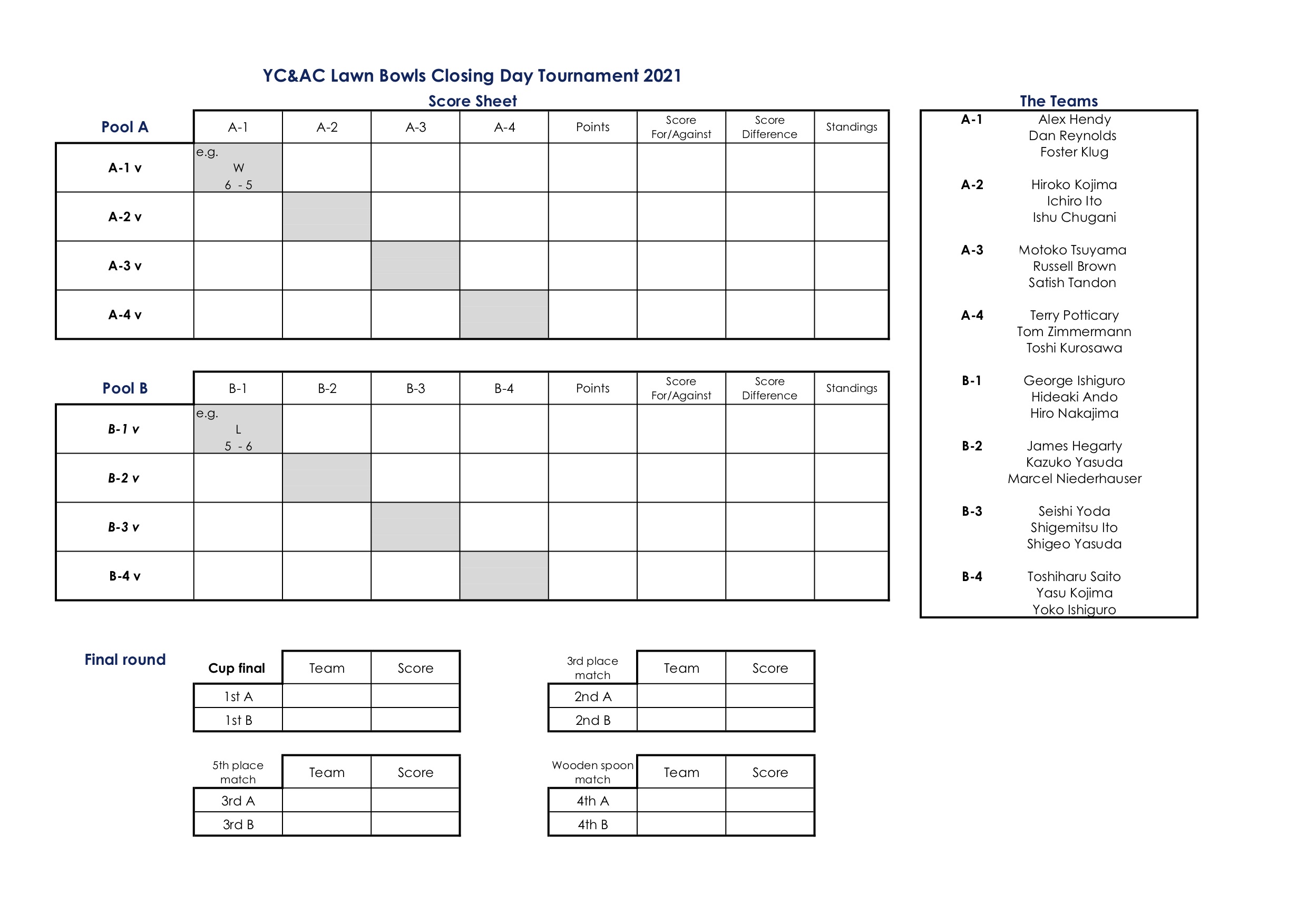 The “draw” for the 2021 Closing Day Tournament has been completed, using an ingenious new “A to Y” sprinkle method (copyright Kaz).