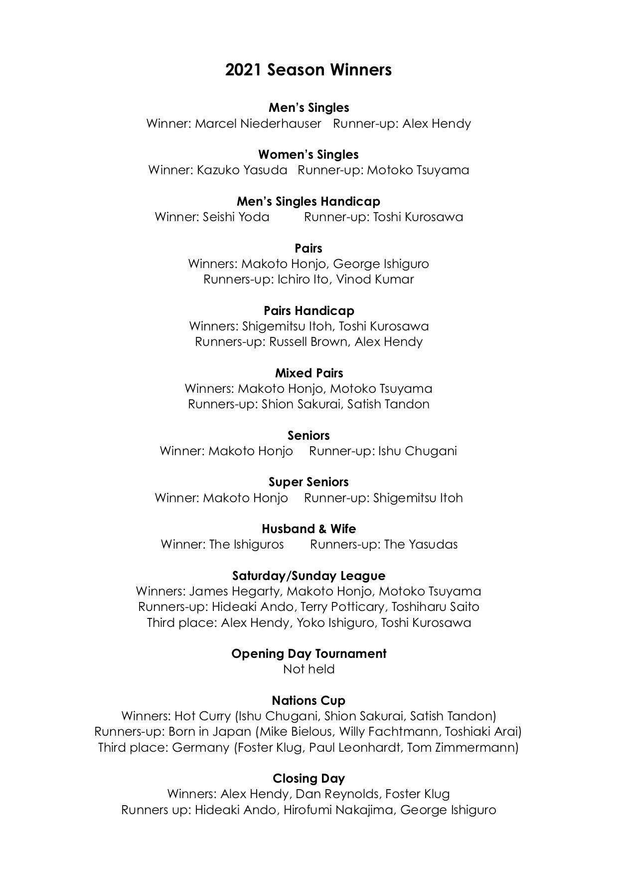 Unfortunately Honjo-san could not attend the Closing Day event to receive his many awards, which included the Saturday/Sunday League in partnership with Motoko and James.