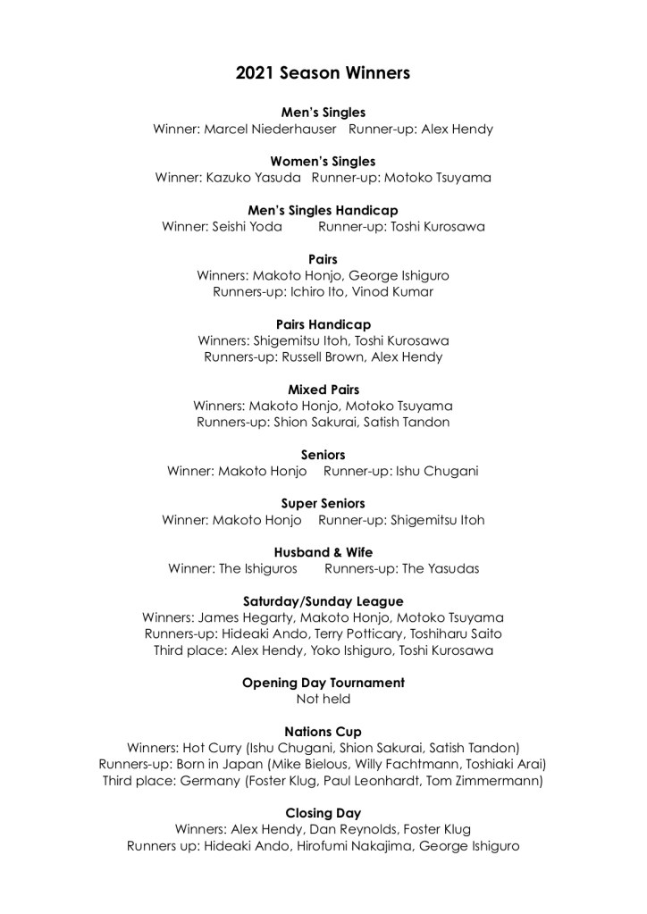 This season’s big winner, certainly in terms of number of tournaments won and prize money earned (!), was of course Honjo-san. What a player this guy is. Super Seniors, Seniors, Pairs (with George), Mixed Pairs (with Motoko), League (with Motoko and James).