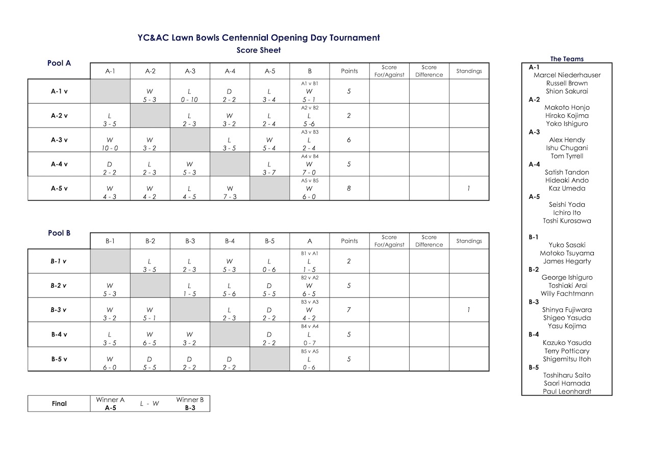 In the Tournament proper, Team Yoda, Kurosawa and Ito finished top of Pool A with a 4-1 win record, while team Fujiwara, Kojima and Yasuda won Pool B on 3-1-1.