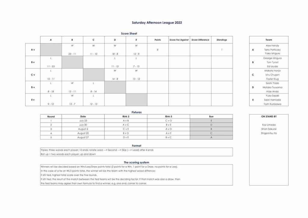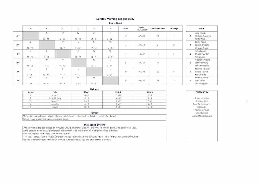 The lawn bowls staple that is the Sunday Morning League was played over five weekends beginning June 5. Going into the fifth and final round, four of the six teams had a chance of winning the title. In the final reckoning, two teams finished on 7 WLD points with Team Hendy, Klug and Tsuyama claiming the title by virtue of a vastly superior score difference over Team Ando, Hamada and Yoda.