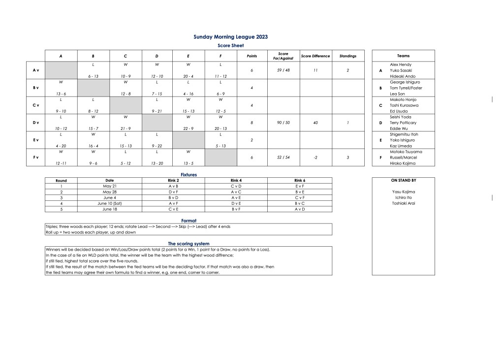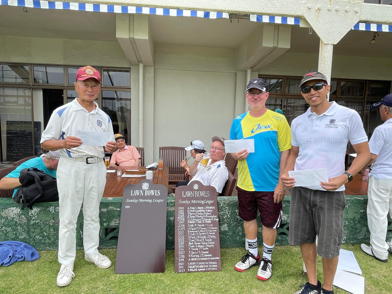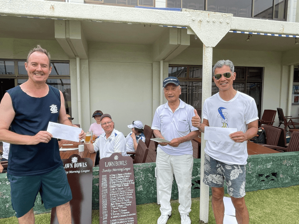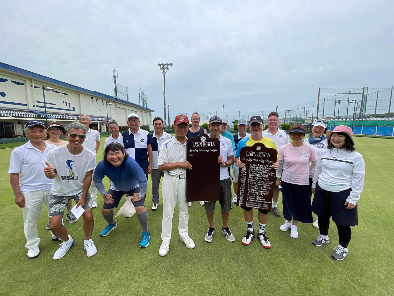 The Sunday Morning League is the thickly sliced “bread and butter” of lawn bowls at YC&AC, a simple and nourishing モーニングセット of a tournament that lasts for as long as it takes. This year 18 bowlers lined up for breakfast, so we formed six triples teams, meaning five rounds of toast in total.
