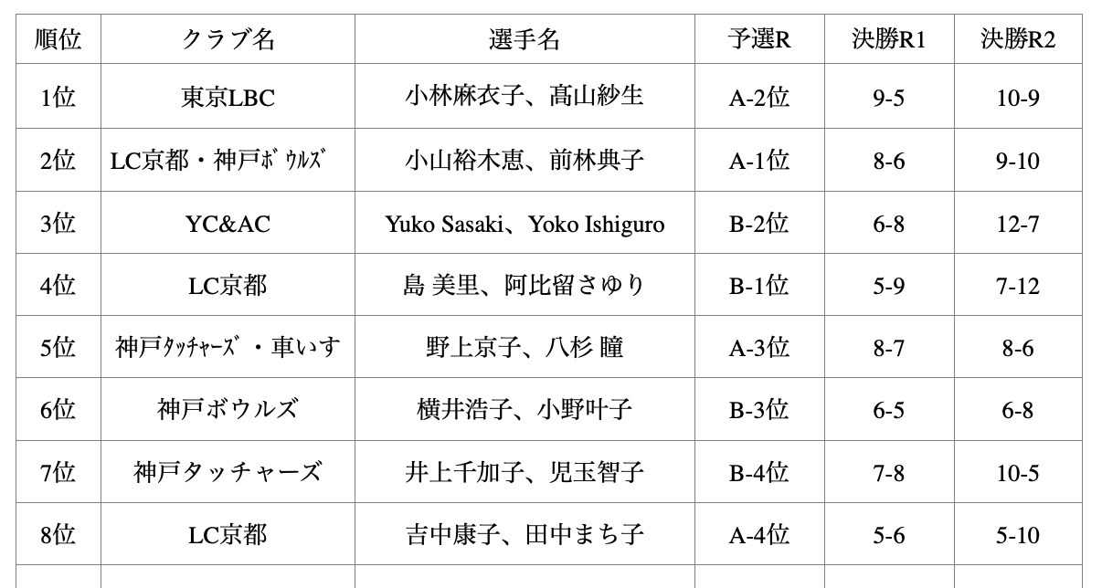Eight pairs in all took part, six from the Kansai region and two from Kanto. Representing YC&AC were Yuko Sasaki (lead) and Yoko Ishiguro (skip).