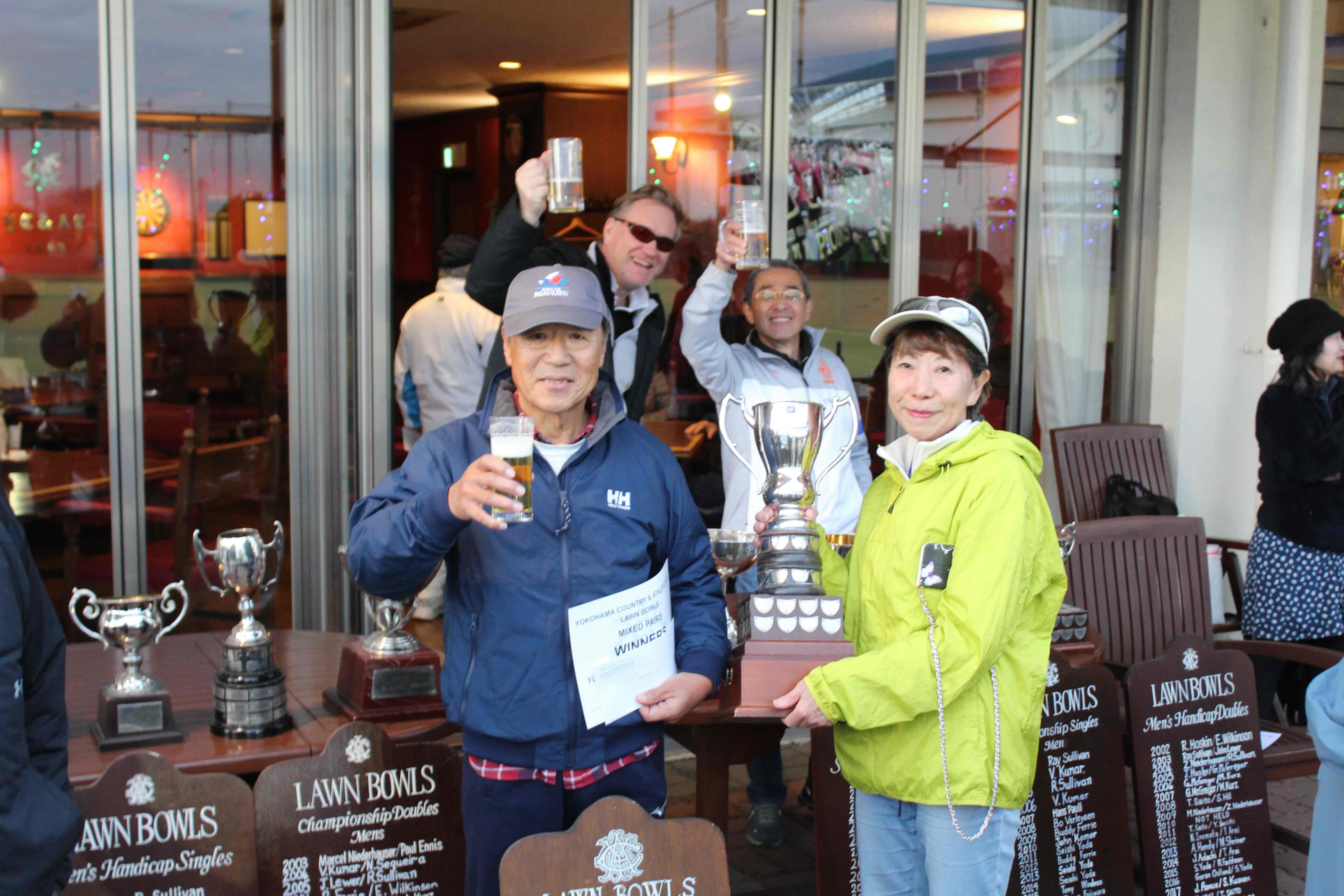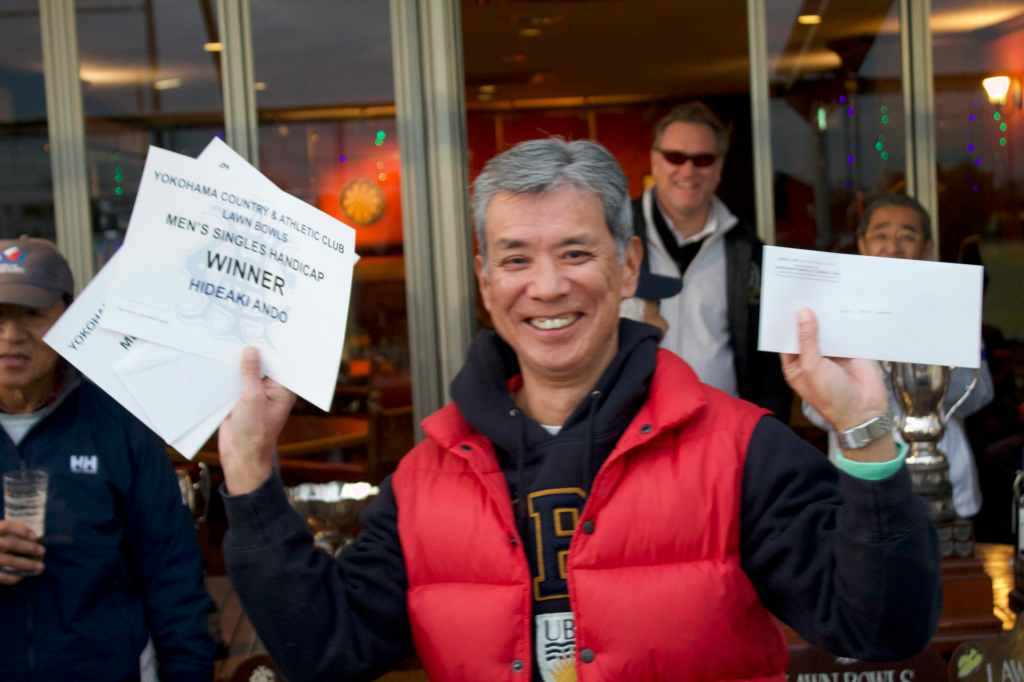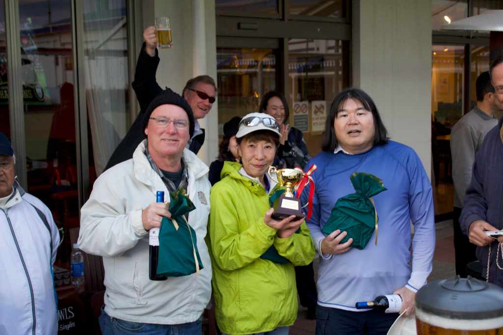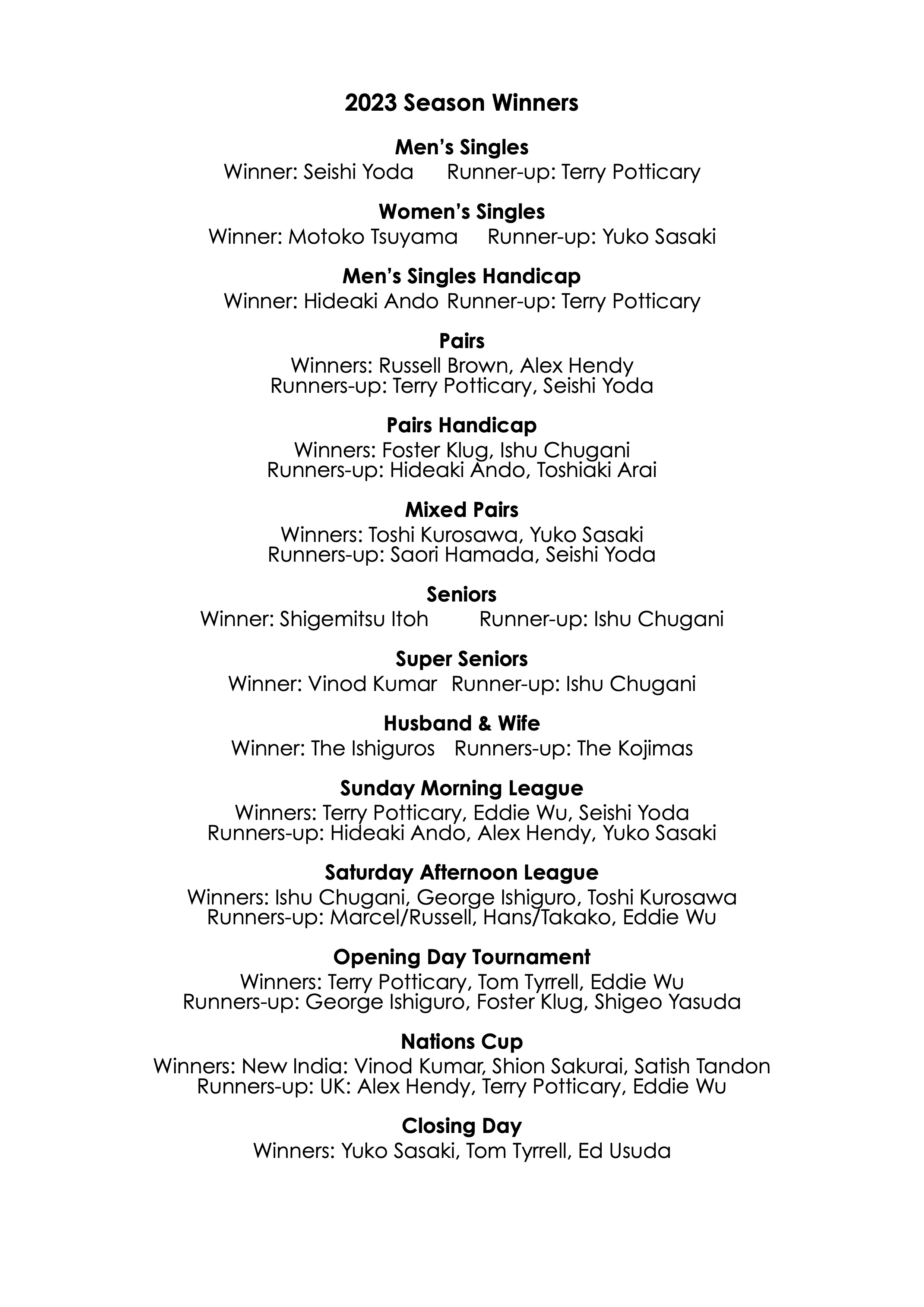 So congratulations once again to 2023 Closing Day Tournament winners Tom, Yuko and Ed, and thanks once again also to prize sponsors Ishu and the Ishiguros for the wine and nuts. This was a most excellent afternoon of bowls.