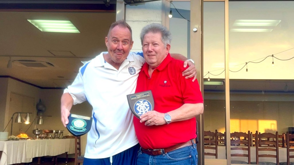 After a hearty buffet and the solemn exchange of Club insignia, entertainment was provided by the bowlers themselves, this thanks to Terry’s familiarity with the portable karaoke set-up and the unbridled enthusiasm of both assembled squads.