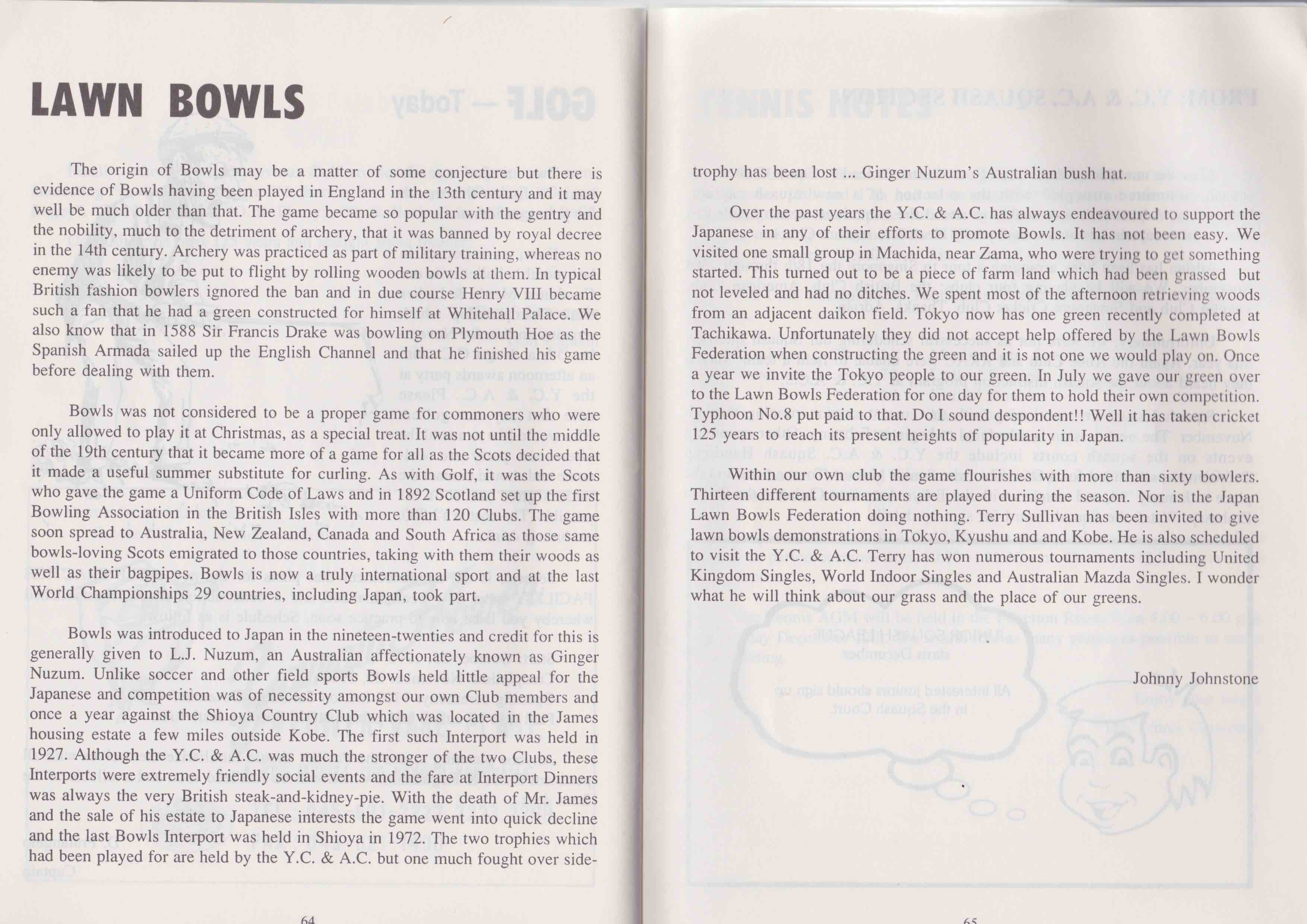 “Bowls was introduced to Japan in the nineteen-twenties and credit for this is generally given to L.J. Nuzum [at the Shioya Country Club], an Australian affectionately known as Ginger Nuzum.” So writes Johnny Johnstone on the history and state of the game in Japan for YC&AC’s 125th anniversary gala programme in 1993. Can anyone help solve the mystery of the lost trophies?